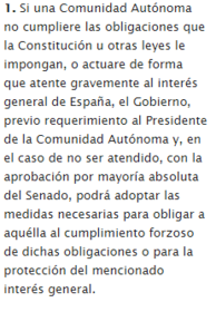 | Artículo 155.1 Si una Comunidad Autónoma no cumpliere las obligaciones que la Constitución u otras leyes le impongan, o actuare de forma que atente gravemente al interés general de España, ¿Qué podrá hacer el Gobierno? | |