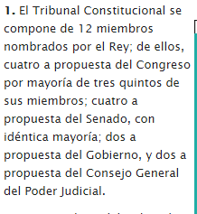 | Artículo 159.1 ¿Por cuántos miembros se compone el Tribunal constitucional? ¿Quién los nombra y quiénes los proponen? | |