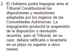 | Artículo 161.2 Cuáles disposiciones podrá impugnar el Gobierno ante el Tribunal Constitucional? ¿Qué producirá la impugnación? ¿En cuál plazo deberá ratificar o levantar el Tribunal la suspensión? | |
