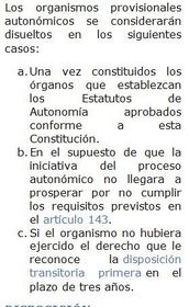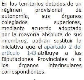 | Disposición Transitoria Tercera | La iniciativa del proceso Autonómico por parte de las Corporaciones locales o de sus miembros, prevista en el apartado 2 del artículo 143, se entiende diferida, con todos sus efectos, hasta la celebración de las primeras elecciones locales una vez vigente la Constitución. |