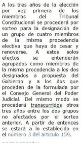 | Artículo 160 ¿Quién nombra al Presidente del Tribunal Constitucional? ¿A propuesta de quién? ¿Por cuál periodo? | El Presidente del Tribunal Constitucional será nombrado entre sus miembros por el Rey, a propuesta del mismo Tribunal en pleno y por un período de tres años. |