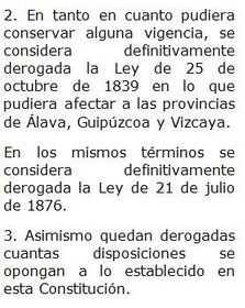 | Disposición Adicional Primera | La Constitución ampara y respeta los derechos históricos de los territorios forales. La actualización general de dicho régimen foral se llevará a cabo, en su caso, en el marco de la Constitución y de los Estatutos de Autonomía. |