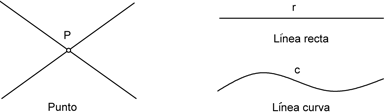 | El punto | Se define como la intersección de dos rectas. No tiene dimensiones, y se nombra con una letra mayúscula (punto P). |