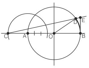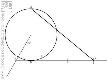 | Rectificación de una circunferencia. Método Kochanski | Trazamos un diámetro vertical AB.Por el punto B trazamos perpendicular al diámetro. Con vértice el centro de la circunferencia trazamos un ángulo de 30º que corta en C a la perpendicular al diámetro.Desde C copiamos 3 veces el radio de la circunferencia para obtener D. AD es la rectificación de la SEMICIRCUNFERENCIA. |