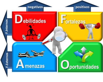 | FODA | FODA es el análisis de las características propias de la organización, es decir, observar cuáles son sus fortalezas y oportunidades en el mercado, por ejemplo: disponibilidad de recursos económicos, personal, calidad del producto, entre otros y, su situación externa a través del estudio de las amenazas y oportunidades en referencia a la situación actual de la competencia y del ámbito político, económico y social por el cual atraviesa el país en donde se desenvuelve, por ejemplo: el pago de los impuestos, la legislación laboral, el desempleo o empleo, los avances tecnológicos, entre otros puntos. Ejemplos de Fortalezas Buen ambiente laboral Proactividad en la gestión Conocimiento del mercado Grandes recursos financieros Buena calidad del producto final Posibilidades de acceder a créditos Equipamiento de última generación Experiencia de los recursos humanos Recursos humanos motivados y contentos Procesos técnicos y administrativos de calidad Características especiales del producto que se oferta Cualidades del servicio que se considera d |