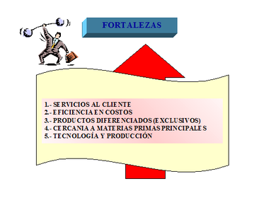 | FORTALEZAS | Fortalezas: son las capacidades especiales con que cuenta la empresa, y que le permite tener una posición privilegiada frente a la competencia. Recursos que se controlan, capacidades y habilidades que se poseen, actividades que se desarrollan positivamente, etc. Ejemplos de Debilidades Salarios bajos. Equipamiento viejo. Falta de capacitación. Problemas con la calidad. Reactividad en la gestión. Mala situación financiera. Incapacidad para ver errores. Capital de trabajo mal utilizado. Deficientes habilidades gerenciales. Poca capacidad de acceso a créditos. Falta de motivación de los recursos humanos. Producto o servicio sin características diferenciadoras. |