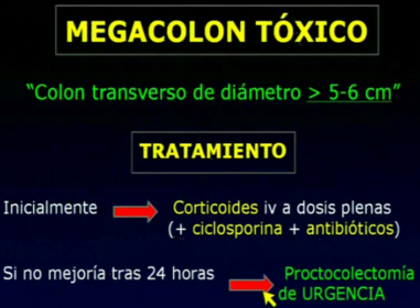 | Megacolon tóxico se trata con corticoides intravenosos y si no mejora, cirugía (colectomía total con ileostomía terminal). La primera prueba ante la sospecha de este cuadro es la radiografía de abdomen. | El paciente con enfermedad celíaca deberá tomar una dieta exenta de gluten de por vida. E. celíaca de adultos: NO es necesario realizar prueba de sobrecarga con gluten para el diagnóstico EN ENF. CELIACA HAY ATROFIA DE MUCOSA INTESTINAL CON HIPERtrofia DE LAS CRIPTAS☺ |