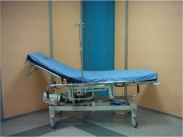 | Camilla de traslado. Hay un modelo que además incorpora chasis, para la realización de radiografías. Los portasueros, se instalan en los laterales, ya que llevan unos agujeros en los largueros para introducirlos.Nunca los pondremos en las esquinas. Lleva vallas laterales escamoteables y portabalas de oxígeno. | |