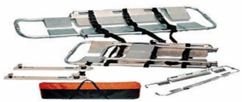 | Camilla de tijera Realizada en aluminio, consta de dos palas laterales, que se unen mediante dos “botones”, los cuales, se encuentran dentro del perímetro de la camilla, a la altura de la cabeza y de los pies. Su manejo requiere un mínimo de dos personas. | |