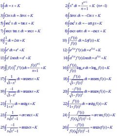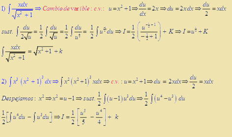 | Metodo de resolución por Sustitución | Consiste en igualar una parte del integrando a una nueva variable, (a esto se le denomina cambio de variable), por ejemplo u, llamada variable auxiliar. Luego de esto, se debe calcular la derivada de la variable auxiliar y realizar las operaciones necesarias, para que ni en el integrando ni en el diferencial, aparezca alguna expresión en términos de la variable original. |