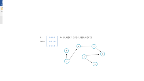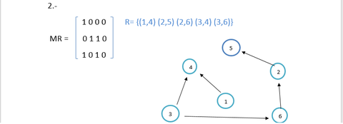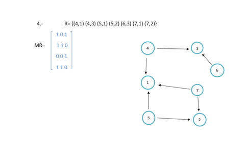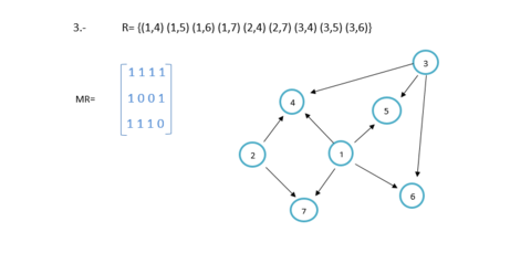 | Sean los conjuntos A= {1, 2,3} y B= {4, 5, 6,7} desarrolla lo siguiente: A) Pares ordenados. B) Matriz de la relación. C) Dígrafos. |