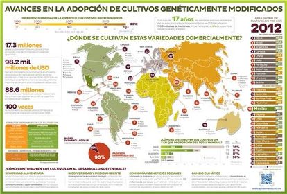 | PANORAMA MUNDIAL Durante el 2012, 17.3 millones de agricultores sembraron cultivos GM (0.6 millones más que en el 2011), beneficiando a más de 50 millones de personas que habitan y trabajan en zonas rurales donde se cultiva algodón y granos básicos GM. | |