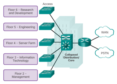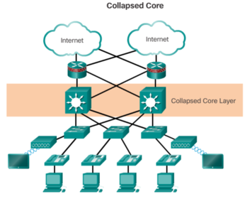 | The primary purpose of the core layer is to provide fault isolation and high-speed backbone connectivity. To build a simplified, scalable, cost-effective, and efficient physical cable layout design, the recommendation is to build an extended-star physical network topology from a centralized building location to all other buildings on the same campus. A two-tier campus network design example for an enterprise campus where the distribution and core layers are collapsed into a single layer. | |