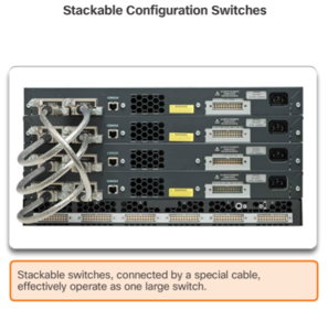 | Stackable Configuration Switches Cisco StackWise technology allows the interconnection of up to nine switches. Switches can be stacked one on top of the other with cables connecting the switches in a daisy chain fashion. Many Cisco stackable switches also support StackPower technology, which enables power sharing among stack members. | |