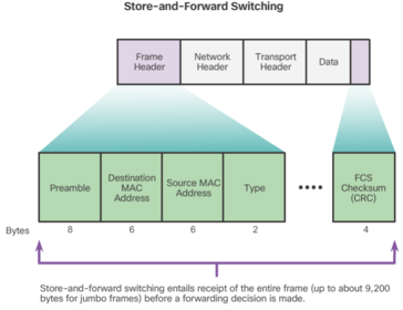 | Automatic Buffering For example, handling an incoming frame traveling into a 100 Mb/s Ethernet port that must be sent out a 1 Gb/s interface would require using the store-and-forward method. With any mismatch in speeds between the ingress and egress ports, the switch stores the entire frame in a buffer, computes the FCS check, forwards it to the egress port buffer and then sends it. A store-and-forward switch drops frames that do not pass the FCS check, therefore does not forward invalid frames. By contrast, a cut-through switch may forward invalid frames because no FCS check is performed. | |
