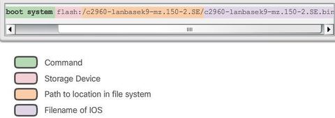 | In the figure, the BOOT environment variable is set using the "boot system" global configuration mode command. Notice that the IOS is located in a distinct folder and the folder path is specified. Use the "show bootvar" command ("show boot" in older IOS versions) to see what the current IOS boot file is set to. | |