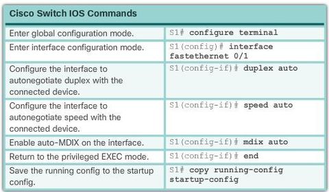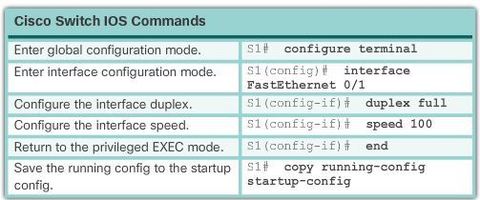 | Switch ports can be manually configured with specific duplex and speed settings. Use the duplex interface configuration mode command to manually specify the duplex mode for a switch port. Use the speed interface configuration mode command to manually specify the speed for a switch port. | |