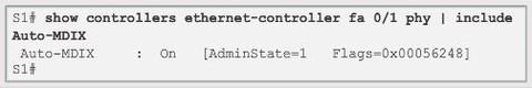 | To examine the auto-MDIX setting for a specific interface, use the: "show controllers ethernet-controller" command with the "phy" keyword. To limit the output to lines referencing auto-MDIX, use the include: "Auto-MDIX" filter | |