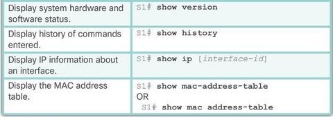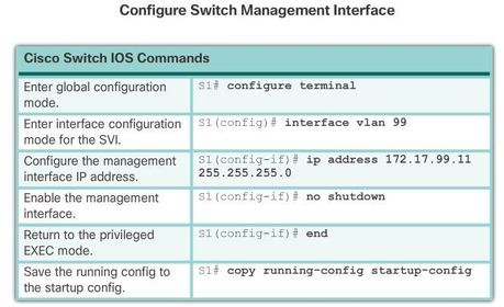 | Configuring Basic Switch Management Access with IPv4 S1(config)# vlan vlan_id S1(config-vlan)# name vlan_name | S1(config-vlan)# exit S1(config)# interface interface_id S1(config-if)# switchport access vlan vlan_id |