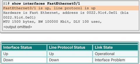 | The first parameter (FastEthernet0/1 is up) refers to the hardware layer and, essentially, reflects whether the interface is receiving the carrier detect signal from the other end. The second parameter (line protocol is up) refers to the data link layer and reflects whether the data link layer protocol keepalives are being received. | |
