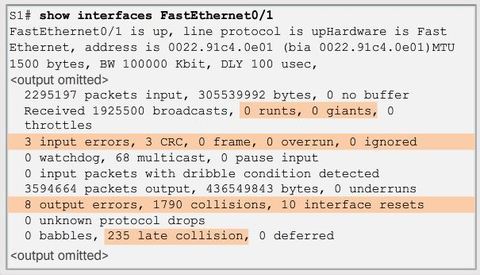 | * Late collisions - A late collision refers to a collision that occurs after 512 bits of the frame have been transmitted. Excessive cable lengths are the most common cause of late collisions. Another common cause is duplex misconfiguration. For example, you could have one end of a connection configured for full-duplex and the other for half-duplex. | |