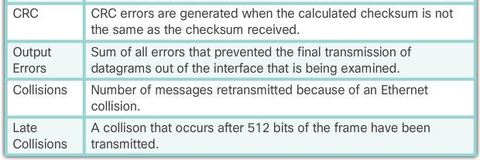 | * CRC errors - On Ethernet and serial interfaces, CRC errors usually indicate a media or cable error. Common causes include electrical interference, loose or damaged connections, or using the incorrect cabling type. If you see many CRC errors, there is too much noise on the link and you should inspect the cable for damage and length. | |