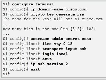 | SSH is assigned to TCP port 22. Telnet is assigned to TCP port 23. To enable SSH on a Catalyst 2960 switch, the switch must be using a version of the IOS software including cryptographic (encrypted) features and capabilities. If IOS filename includes the combination “k9” supports cryptographic (encrypted) features and capabilities. | |