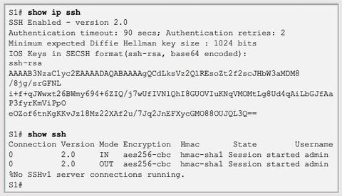| Use the show ip ssh command to verify that the switch supports SSH. If the switch is not running an IOS that supports cryptographic features, this command is unrecognized. Note: To delete the RSA key pair, use the "crypto key zeroize rsa" global configuration mode command. After the RSA key pair is deleted, the SSH server is automatically disabled. | |