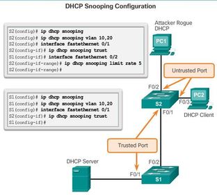 | DHCP snooping is a Cisco Catalyst feature that determines which switch ports can respond to DHCP requests. Ports are identified as trusted and untrusted. Trusted ports can source all DHCP messages, including DHCP offer and DHCP acknowledgement packets; untrusted ports can source requests only | Trusted ports host a DHCP server or can be an uplink toward the DHCP server. If a rogue device on an untrusted port attempts to send a DHCP offer packet into the network, the port is shut down. This feature can be coupled with DHCP options in which switch information, such as the port ID of the DHCP request, can be inserted into the DHCP request packet. |