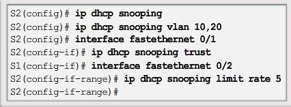 | Step 1. Enable DHCP snooping using the ip dhcp snooping global configuration mode command. Step 2. Enable DHCP snooping for specific VLANs using the ip dhcp snooping vlan number command. Step 3. Define ports as trusted at the interface level by defining the trusted ports using the ip dhcp snooping trust command. Step 4. (Optional) Limit the rate at which an attacker can continually send bogus DHCP requests through untrusted ports to the DHCP server using the ip dhcp snooping limit rate rate command. | |