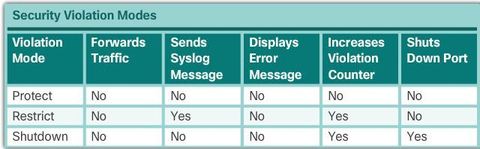 | To change the violation mode on a switch port, use the: "switchport port-security violation {protect | restrict | shutdown}" interface configuration mode command. Shutdown - In this (default) violation mode, a port security violation causes the interface to immediately become error-disabled and turns off the port LED. It increments the violation counter. When a secure port is in the error-disabled state, it can be brought out of this state by entering the shutdown and no shutdown interface configuration mode commands. | |