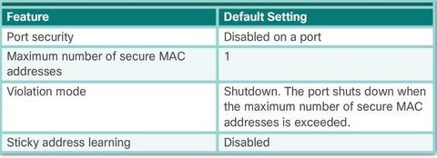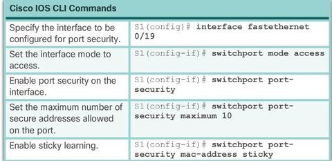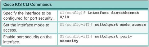 | To configure an interface to convert dynamically learned MAC addresses to sticky secure MAC addresses and add them to the running configuration, you must enable sticky learning. Sticky learning is enabled on an interface by using the "switchport port-security mac-address sticky" interface configuration mode command. | Sticky secure MAC addresses can also be manually defined with: "switchport port-security mac-address sticky (mac-address)" If sticky learning is disabled by using the no switchport port-security mac-address sticky interface configuration mode command, the sticky secure MAC addresses remain part of the address table, but are removed from the running configuration. |