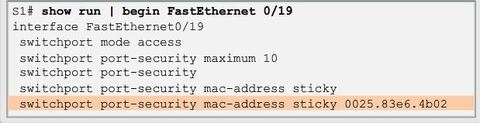 | As stated earlier, the maximum number of secure MAC addresses can be manually configured. In this example, the Cisco IOS command syntax is used to set the maximum number of MAC addresses to 10 for port 0/19. The violation mode is set to shutdown, by default. | |