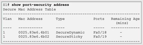 | Port security limits the number of valid MAC addresses allowed on a port. * Static secure MAC addresses - MAC addresses that are manually configured on a port by using the "switchport port-security mac-address (mac-address)" interface configuration mode command. MAC addresses configured in this way are stored in the address table and are added to the running configuration on the switch. | * Dynamic secure MAC addresses - MAC addresses that are dynamically learned and stored only in the address table. MAC addresses configured in this way are removed when the switch restarts. * Sticky secure MAC addresses - MAC addresses that can be dynamically learned or manually configured, then stored in the address table and added to the running configuration |