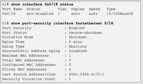| When a port is error disabled, it is effectively shut down and no traffic is sent or received on that port Note: The port protocol and link status is changed to down. The port LED will turn off. The "show interfaces" command identifies the port status as "err-disabled" The output of the "show port-security interface" command now shows the port status as secure-shutdown. | |