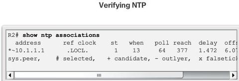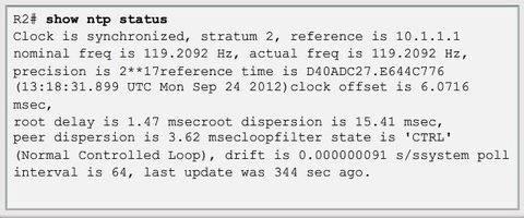 | NTP can get the correct time from an internal or external time source including the following: * Local master clock * Master clock on the Internet * GPS or atomic clock Figure: Router R2 is configured as an NTP client, while router R1 serves as an authoritative NTP server. | |