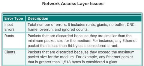 | “Input errors” is the sum of all errors in datagrams that were received on the interface being examined. * Runt Frames - Ethernet frames that are shorter than the 64-byte minimum allowed length are called runts. Malfunctioning NICs are the usual cause of excessive runt frames, but they can be caused by the same issues as excessive collisions | |