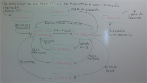 | ETAPAS DEL CICLO DE VIDA DE UN PROCESO | *INICIADO: UN PROCESO SOLICITA SU EJECUCIÓN AL SO *LISTO PARA EJECUTARSE: EL PROCESO TIENE ASIGNADO LOS RECURSOS NECESARIOS PARA SU EJECUCIÓN *EN EJECUCIÓN: PROCESO TOMA CONTROL DE LA CPU PARA INICIAR O REANUDAR SU EJECUCIÓN *TERMINADO: EL PROCESO LIBERA LOS RECURSOS QUE LE FUERON ASIGNADOS *EN ESPERA: PROCESO DETENIDO REALIZANDO UNA OP DE E/S *SUSPENDIDO: PROCESO DETENICO POR PETICIÓN DIRECTA DEL S.O. * DORMIDO: DETENIDO INDEFINIDAMENTE POR UN ERROR EN SU EJECUCIÓN, EVENTO INESPERADO. ESTADO INDESEABLE Y DEBE EVITARSE |