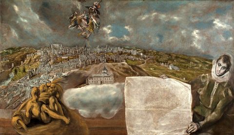 | El Greco, "Vista y plano de Toledo", 1610-1614, Toledo, Museo de El Greco. -La pintura de El Greco siempre vinculada a la veneciana. -Una descripción de ciudad sin fines cartográficos ni fidelidad. La imagen ensalza la subjetividad del pintor y la imagen de Toledo como símbolo. | |
