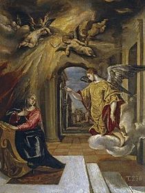 | El Greco, "La Anunciación". Anterior a 1570, Madrid. Museo Nacional del Prado. -La representación es muestra de una apropiación estilística de un grabado. -La ambición intelectual de El Greco en sus interpretaciones iconográficas. -Hace referencia a las arquitecturas de Vitruvio que se repetirán en otras obras. | |