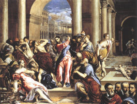 | El Greco, "La purificación del templo", 1570-1575. Minneapolis, The Minneapolis Institute of Art. -Ambiciosa composición donde se puede leer la influencia de Tintoretto y la admiración por Palladio. -Destaca el retrato de los cuatro pintores en la parte inferior derecha del cuadro, se han estudiado como efigies de Giulio Clovio, Miguel Ángel, Tiziano y el cuarto como Rafel, Correggio o un posible autorretrato. El Greco declarándose deudor de sus maestros. | |