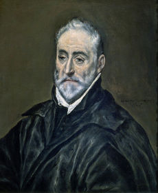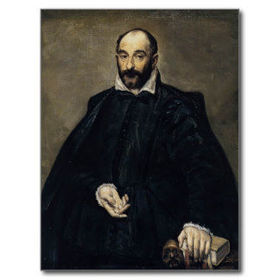 | El Greco. "Retrato de Antonio de Covarrubias", 1600-1602. París, Musée du Louvre. -Amigo del pintor, retratado también en palabras en los márgenes del Vitruvio (edición de Barbaro) que Covarrubias le regaló. -La rica biblioteca de El Greco fue de importancia en su obra, como pintor erudito, como inspiración, el Vitruvio ilustrado por Palladio, así como la colección de estampas que poseía. | |