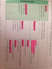 | Biomoléculas o principios inmediatos | Inorganicas (agua, CO2 y sales minerales) Orgánicas ( glucidos, lípidos, proteínas y ácidos nucleicos) |