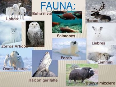 | Tundra: Tundra significa llanura sin árboles y hace referencia a territorios generalmente abiertos y llanos. Y de clima subglacial y subsuelo helado, localizados por encima de los 60° de latitud en el hemisferio norte. Flora: Musgos, juncos, hierbas y líquenes pueden haber lagos y ríos. Fauna: focas, nutrias, caribú, reno, buey almizclero, lobo, liebre ártica, oso blanco (en el extremo norte) halcón gerifalte, cabra nival, oso kodiak, búho, zorro ártico y el lemming | |