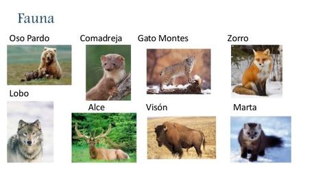 | Taiga: Es el bosque boreal. La palabra boreal significa viento del norte o septentrional. Se caracteriza por sus bajas temperaturas, las cuales pueden llegar a ser de 40° bajo cero en el invierno, su temperatura media anual varía entre-5°C y 5°C. Las coníferas son árboles y arbustos gimnospermos, como el ciprés y los pinos. Flora: Abedules, alisos, sauces, álamos, abetos rojos y negros, líquenes y musgos, también se encuentran turbetas, lagos y ríos de aguas frías. Fauna: Oso pardo, comadreja, ardilla, caribú, zorro, alce, lobo. | |