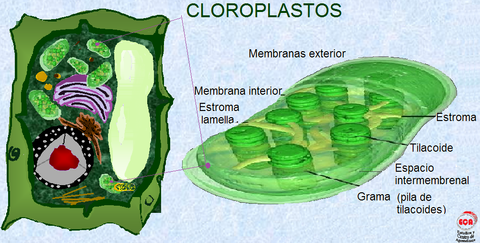 | Cloroplastos | En ellos se tiene lugar el proceso de fotosíntesis. Contienen una sustancia de color verde que recibe el nombre de clorofila y que confiere a las plantas su distintivo color verde. |