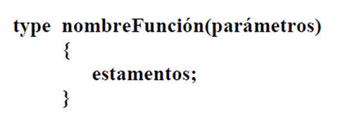 | ¿Cómo se declara una función? | Una función se declara de acuerdo a la sintaxis anterior. "type" es el tipo de valor que devuelve la función y "parámetros" los valores que se deben pasar a la función para que se ejecute. |