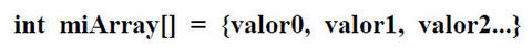 | ¿Qué hace esta instrucción? | Esta instrucción declara o define "miArray" como un arreglo que contiene n datos de tipo entero ("int") y cuyos valores iniciales son "valor0", "valor1", "valor2", etc. Estos valores están asociados, respectivamente, a las posiciones e índices 0, 1, 2, etc. |