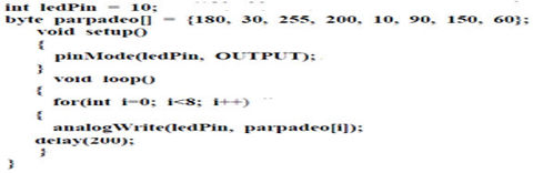 | ¿Qué hace esta función? Asuma que 'ledPin' y 'parpadeo[]' han sido previamente declarad@s como de tipos 'int' y 'byte' les han sido asignado valores iniciales arbitrarios apropiados. También asuma que el valor de 'ledPin' ha sido asignado a un pin configurado como salida análoga tipo PWM | La función utiliza un bucle tipo for para enviar a la salida asociada a la variable 'ledPin' el valor que figura en la posición del array 'parpadeo[]' especificada por el indice 'i'. Hecho esto ejecuta un retardo de 200 ms. El indice i arranca en 0 y se incrementa hasta llegar a 7. A partir de entonces el bucle for deja de ejecutarse. |