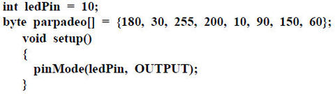 | ¿Qué hace el siguiente conjunto de instrucciones? | "int ledPin=10;" declara "ledPin" como una variable global de tipo entero y le asigna un valor inicial de 10. "byte parpadeo[]={180, 30...};" declara "parpadeo" como un array global de tipo byte de 8 posiciones y le asigna a las posiciones 0 ... 7 los valores iniciales 180 ... 60, respectivamente. "pinMode(ledPin,OUTPUT;" en la función setup() configura el pin 10 (valor asignado a ledPin) como pin de salida. |